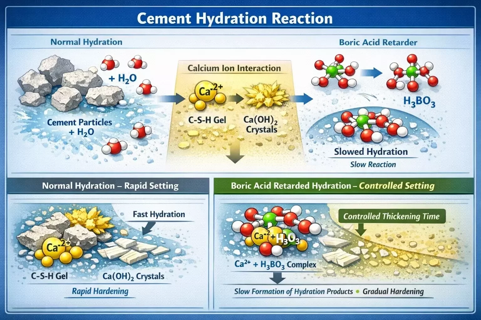 Chemical retarders such as boric acid provide engineers with a reliable method to slow down hydration reactions and extend slurry pumpability without sacrificing final cement strength.