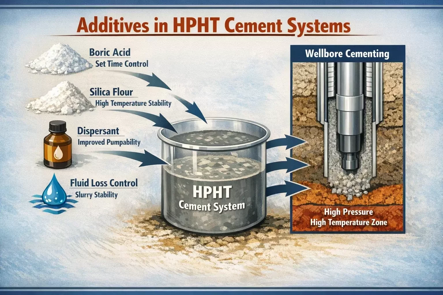 HPHT cement systems frequently incorporate additional additives alongside boric acid. For example, silica flour is often included to prevent strength retrogression in high-temperature environments. Dispersants may be added to control slurry viscosity and improve flow characteristics during pumping.